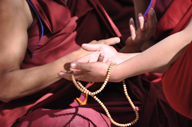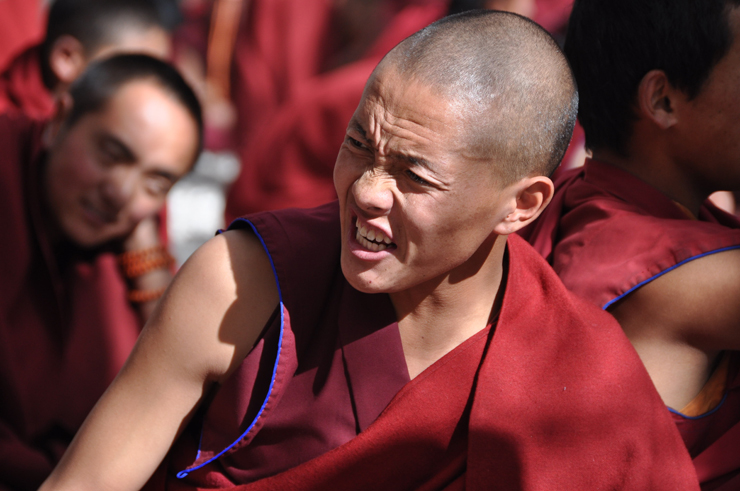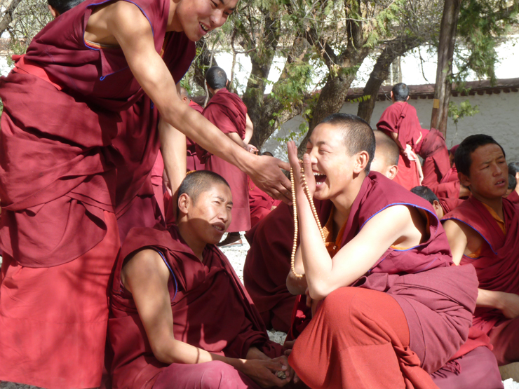 Nous sommes restées plus d’une heure assises à écouter des discussions philosophiques auxquelles nous n’avons bien évidemment rien saisi. Si ce n’est que le moine assis est questionné par un moine debout sur une question théologique. Le fait de frapper dans ses mains marque l’interrogation. On n’a pas le droit de taper ceux qui donnent des mauvaises réponses, mais on peut le leur faire comprendre par un grand geste de frottement de mains. Au bout d’un moment les rôles changent et le questionneur devient questionné. Les grimaces et autres expressions pour aider badaud de passage à comprendre sont les bienvenues. Du moins dans le coin des jeunes. Car plus loin, de vieux moines plus sages débattent de façon beaucoup plus digne et discrète.