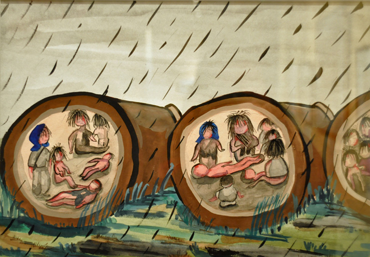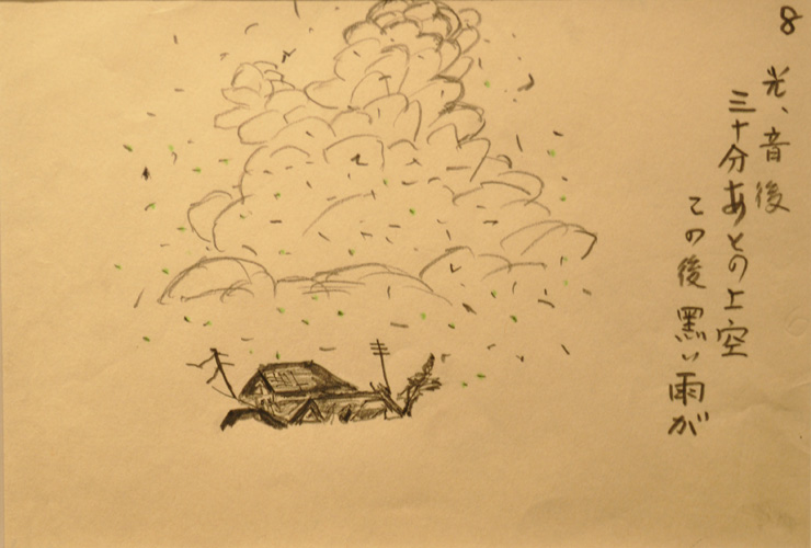 Four in my family (father, mother, younger brother and I) were exposed to the bomb at home. On our way to escape from the bombing, the rain began to fall. It was the black rain. There were clay pipes in a grassy area in a marchland. We stayed inside the clay pipes until the rain let up.