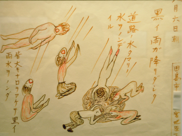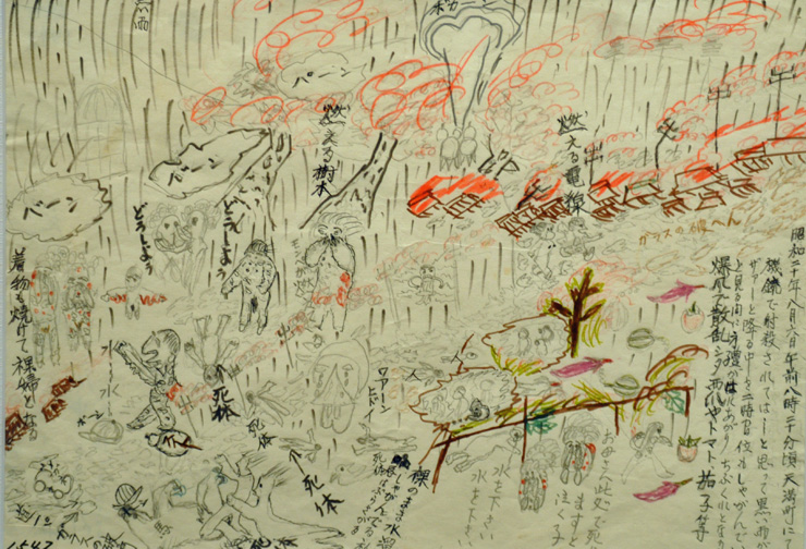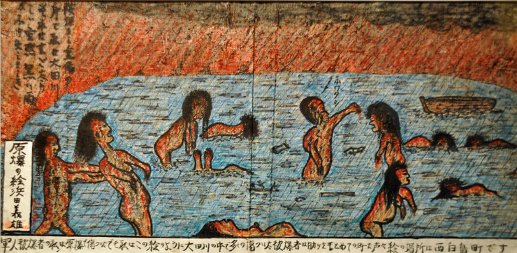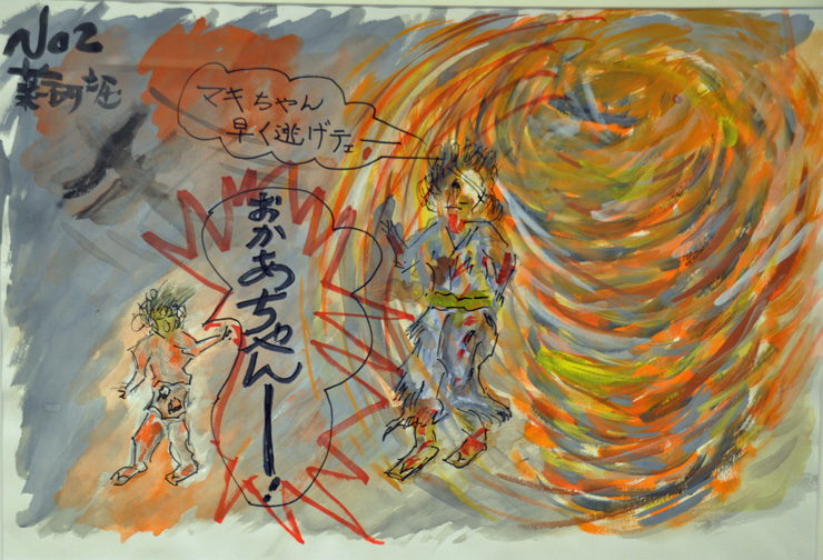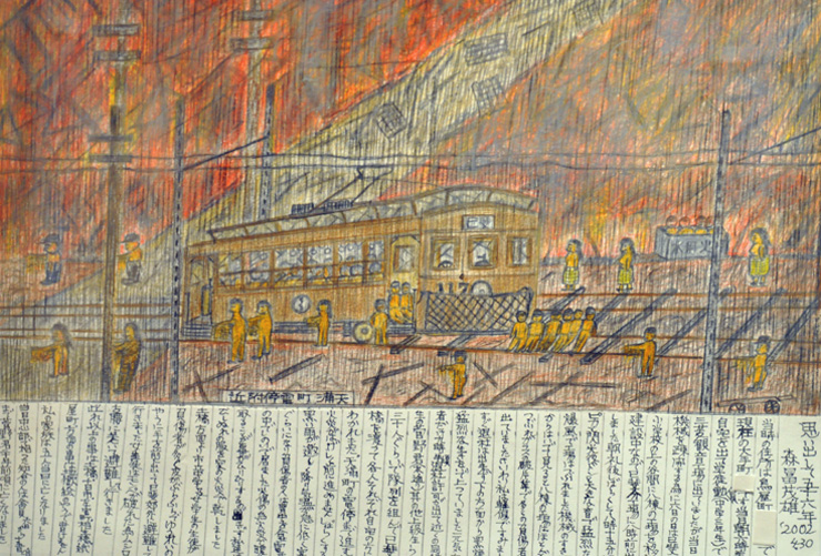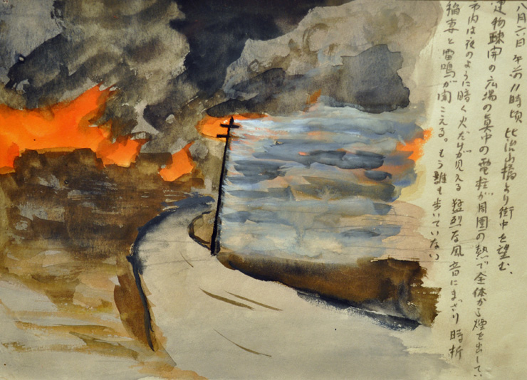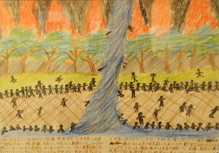 In the roaring sound of the spreading rage of flames, there were several explosions and spewing black smoke. Then, I saw a dark red tornado developing with a kind of bizarre hum. It swirled hight up, lifting objects ranging from roofs to people, horses, cars, storm doors, tatami mats, and galavanized iron sheets. The angry tornado raved like a raging beast, hurling everything into the fires and rivers and onto the ground.