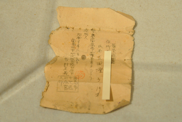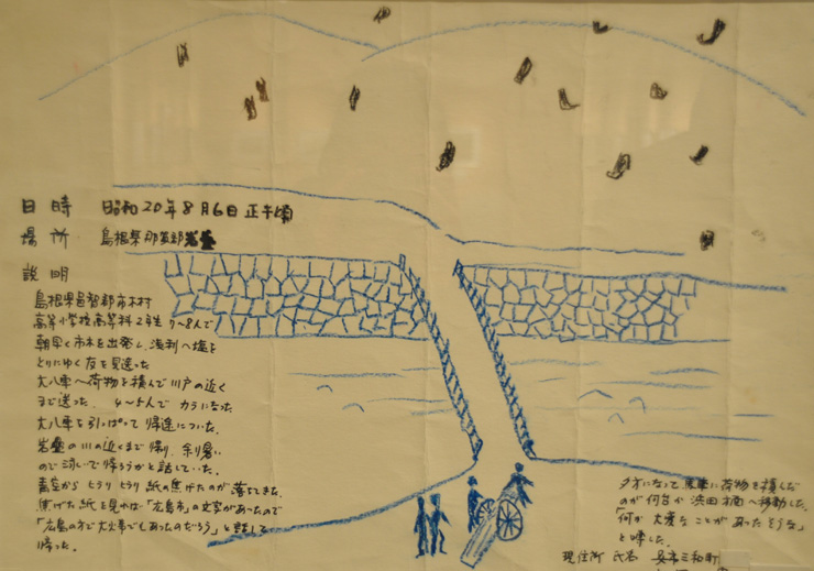 Pieces of scorched paper were floating down from the blue sky. Taking a look at one of the pieces, I found the characters ’Hiroshima City’ on it. So, I said, ‘there must have been a big fire in Hiroshima’ and left for home.