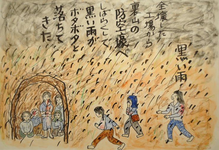 When washing my face with a bloody nose at a well outside, large drops of rain began splashing down. ‘America sprinkled petroleum!’ ‘Maybe they’re trying to annihilate us by setting fire on the mountains.’ Our faces stiff with fear, all of us ran into air raid shelters. The rain, which had been mixed with pitch black sand, stained our bloody outer garments and bandages with black dots. It was later revealed that this black rain was a dangerous rain containing radioactivity.