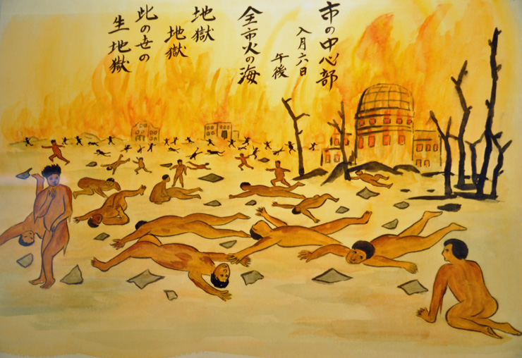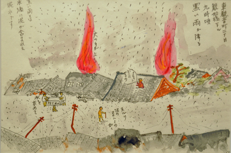 Hiroshima turned into a sea of flames. At night, seeing the sea flames spreading as far as the eye could see, I thought Hiroshima was going to disappear. No matter how much I craved water, all the water was oily. Though we had no drinking water, the black rain kept falling on us.
