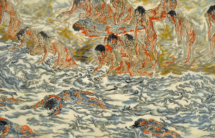 People scrambled to the river due to the heat from the burning pine trees. When I swam across the river to the opposite bank, a tornado developed and my coworker and I were swirled up in the tornado. Joining our hands, I nearly drowned in the swirled-up water, swallowing a lot of water, and then passed out. After a while, when I came to, I found that I had been hurled down to the riverside.