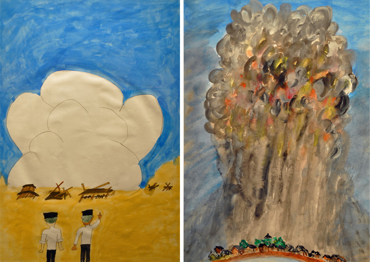 On a été particulièrement touchés par les dessins du musée d’Hiroshima sont voici deux séries. La première regroupe des dessins effectués par les survivants de la bombe. Certains sont d’époque, d’autres ont été réalisés bien après dans les années 2000. Des dessins et objets parviennent encore et toujours au musée.
