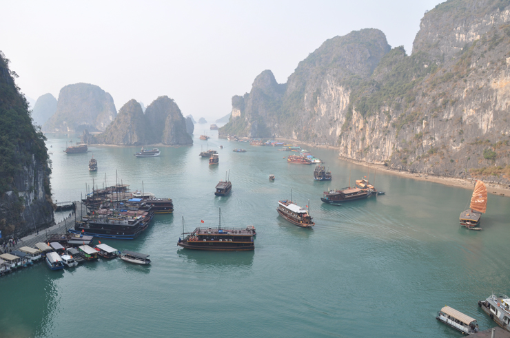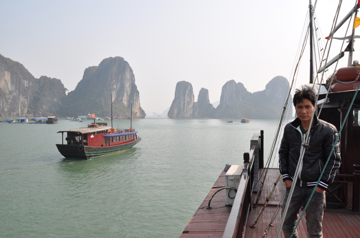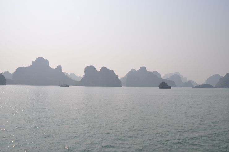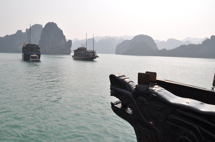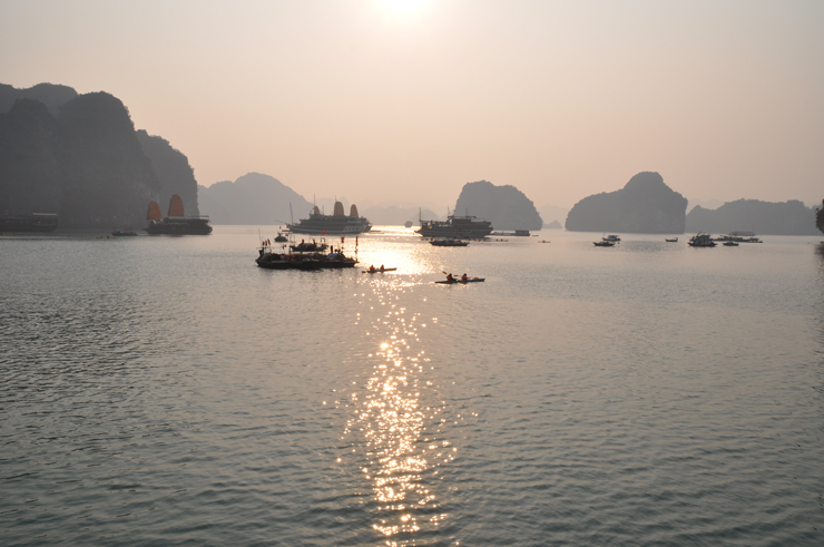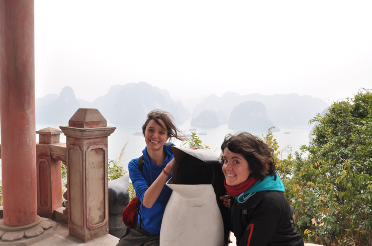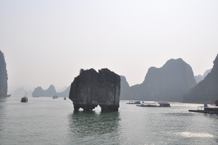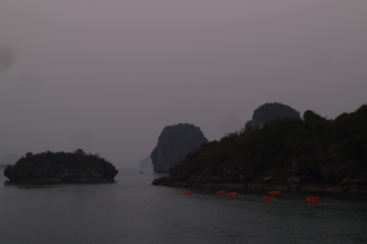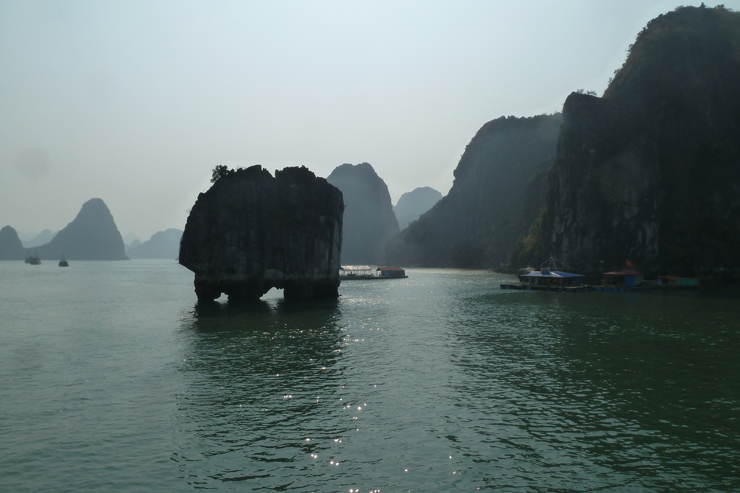 Halong signifie dragon et le nom de la baie vient d’une sombre histoire familiale comme on en voit partout. Maman dragon, qui habitait dans les parages, aurait soit disant piqué une colère noire et aurait légèrement détérioré le paysage, qui une fois envahi par la mer aurait donné naissance a la baie. Bébé dragon, quand a lui, se serait occupé de la baie plus petite qui jouxte Halong. Les rochers semblent être posés a l’envers et sont aussi troués que du gruyère, à se demander comment tout ça tient encore debout. La baie est immense et chaque petite île renferme des grottes, des jungles ou des singes. Des gens vivent ici sur des villages flottants à l’abri des rochers et circulent en barque pour faire du commerce. Chaque plateforme de village contient un chien, un détail qui a l’air important ici. On a eu la chance de pouvoir faire un peu de kayak et de passer sous une voute pour explorer une baie intérieure. Le soir venu, nous avons pu jouer à la croisière s’amuse dans la salle à manger du bateau, avec sa table décorée de fleurs coupées dans des légumes. Ensuite quelqu’un est venu frapper à la fenêtre de notre chambre (donnant sur la mer) pour nous proposer des fruits.