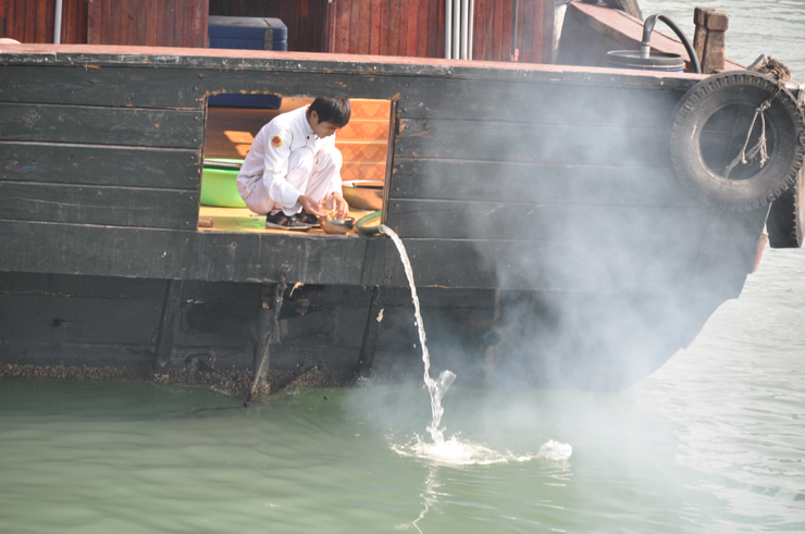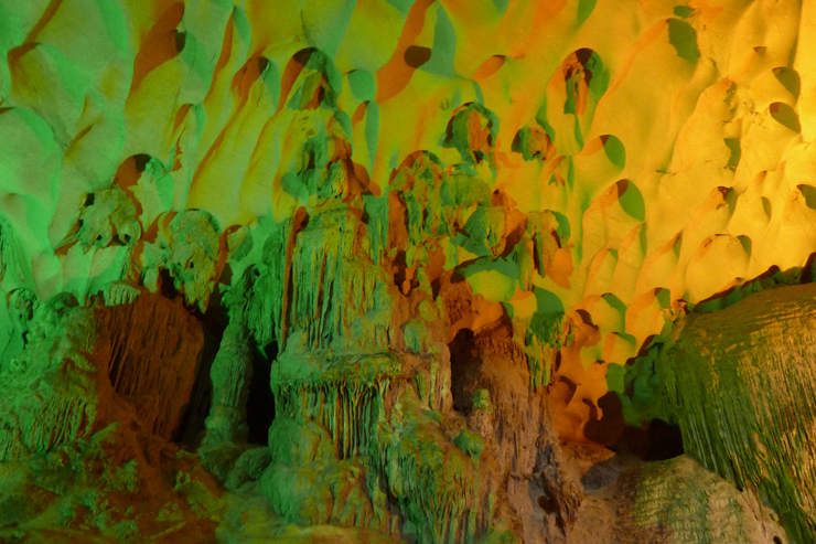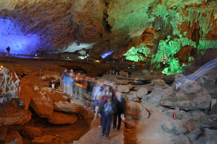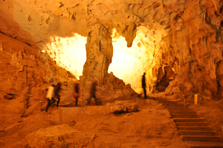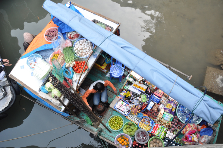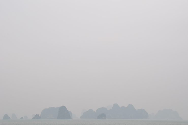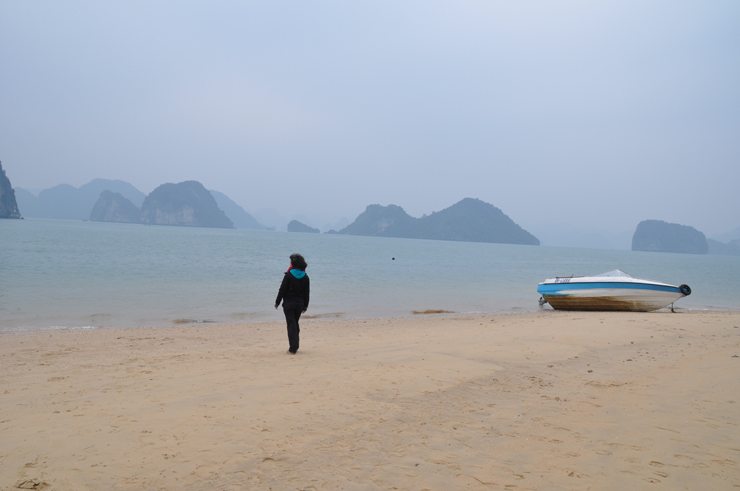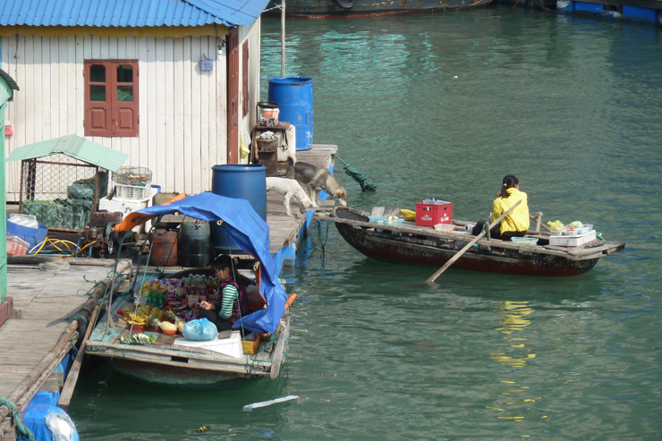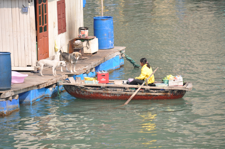 Halong signifie dragon et le nom de la baie vient d’une sombre histoire familiale comme on en voit partout. Maman dragon, qui habitait dans les parages, aurait soit disant piqué une colère noire et aurait légèrement détérioré le paysage, qui une fois envahi par la mer aurait donné naissance a la baie. Bébé dragon, quand a lui, se serait occupé de la baie plus petite qui jouxte Halong. Les rochers semblent être posés a l’envers et sont aussi troués que du gruyère, à se demander comment tout ça tient encore debout. La baie est immense et chaque petite île renferme des grottes, des jungles ou des singes. Des gens vivent ici sur des villages flottants à l’abri des rochers et circulent en barque pour faire du commerce. Chaque plateforme de village contient un chien, un détail qui a l’air important ici. On a eu la chance de pouvoir faire un peu de kayak et de passer sous une voute pour explorer une baie intérieure. Le soir venu, nous avons pu jouer à la croisière s’amuse dans la salle à manger du bateau, avec sa table décorée de fleurs coupées dans des légumes. Ensuite quelqu’un est venu frapper à la fenêtre de notre chambre (donnant sur la mer) pour nous proposer des fruits.
