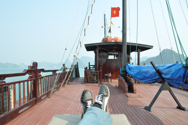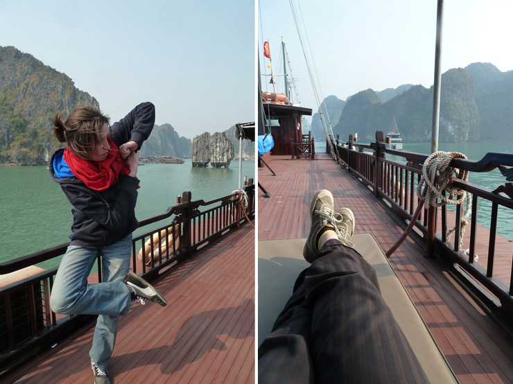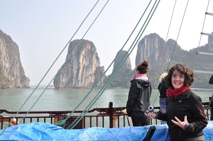 On ne pouvait pas s’en aller sans faire un petit tour sur la baie d’Halong. C’est même principalement pour elle que nous sommes passées par le Vietnam. Et sachez que la baie d’Halong ne déçoit jamais personne ! Nous étions 8 touristes au total sur la « jonque » pour une séjour de 2 jours et une nuit. Notre bateau avait une voile pour faire jolie mais non dépliée. En effet, les jonques véritables sont rares sur la baie et beaucoup plus chères.